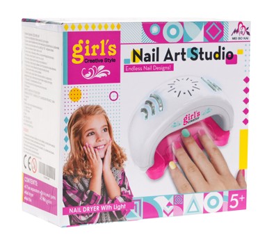 Set za manikuru s priborom je siguran i interaktivan set namijenjen djevojčicama od 5 godina. Set sadrži: sušač za nokte, tri laka za nokte, turpiju, dva separata za prste i nokte ukrase. Sušač za nokte stvarno suši nokte i proizvodi zvukove prilikom sušenja, a gornji dio je osvijetljen svjetlima. Napaja se sa 2 x AAA 1.5V baterijama (nisu uključene).