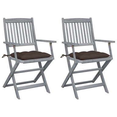 Suvremeni set drvenih blagovaonskih stolica s jastucima dodaje dašak prirodnog stila vašem vrtu, terasi ili dvorištu. Set sklopivih stolica izvrstan je izbor za objedovanje. Ove blagovaonske stolice napravljene su od masivnog bagremovog drva, tropskog tvrdog drva, zbog čega su otporne na vremenske utjecaje i izdržljive za dugogodišnju upotrebu. Masivno drvo bagrema ima snagu da podnese težinu i izdrži trošenje uzrokovano vremenom. Siva izbijeljena površina lako se čisti vlažnom krpom. Stolice se mogu sklopiti radi uštede prostora kad se ne upotrebljavaju. Uz to, uključeni jastuci daju vam dodatnu udobnost dok se odmarate ili objedujete. Svaki jastuk sadrži dva seta vezica za snažno pričvršćivanje na stolicu. - Boja jastuka: Smeđe-siva - Materijal stolice: Masivno bagremovo drvo (brušeno) premazano sivom, izbijeljenom bojom - Materijal jastuka: Tkanina (100 % poliester) - Dimenzije stolice: 54 x 57 x 91 cm (Š x D x V) - Dimenzije jastuka: 40 x 40 x 7 cm (D x Š x Deblj.) - Dubina sjedala: 39 cm - Visina sjedala od tla: 45 cm - Sklopivi dizajn - Sadrži 2 seta vezica za pričvršćivanje jastuka za sjedalo - Sastavljanje potrebno: Da - Isporuka sadrži: - 2 x sklopiva stolica - 2 x jastuk za sjedalo