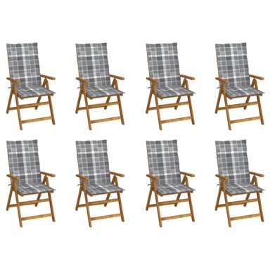 Set drvenih vrtnih stolica dizajniran je kako bi dodao starinski izgled bilo kojoj večeri u vašem vrtu, dvorištu ili na terasi. Ova sklopiva stolica napravljena je od masivnog bagremovog drva, tropskog tvrdog drva, zbog čega je stabilna i izdržljiva. Površina premazana uljem lako se čisti vlažnom krpom. Blagovaonska stolica može se podesiti u 5 položaja, što vam pruža najbolju moguću udobnost sjedenja. Također se može sklopiti radi uštede prostora kad nije u uporabi. Uključeni jastuci pružaju dodatnu udobnost. Napomena: Kako biste produžili vijek trajanja svog vanjskog namještaja, preporučujemo vam da ga redovito čistite i ne ostavljate ga nepotrebno na otvorenom bez zaštite. Čišćenje: Upotrijebite blagu otopinu sapuna Pohrana: Ako je moguće, čuvajte na hladnom i suhom mjestu u zatvorenom. Ako se proizvod čuva na otvorenom, zaštitite ga vodootpornom navlakom. Obrišite i osušite višak vode ili snijega s ravnih površina nakon kiše ili snijega. Omogućite dovoljnu cirkulaciju zraka kako biste izbjegli oštećenja od vlage. - Materijal stolice: Masivno bagremovo drvo s uljnim premazom - Materijal jastuka: Tkanina (100 % poliester) - Dimenzije stolice: 57 x 69 x 111 cm (Š x D x V) - Dimenzije jastuka: 120 x 50 x 3 cm (D x Š x Deblj.) - Sklopivo za jednostavnu pohranu i transport - Jastuk ima 1 elastičnu traku i 2 seta vezica - Sa sivim kariranim uzorkom - Sastavljanje potrebno: Da - Isporuka sadrži: - 8 x vrtna stolica - 8 x jastuk