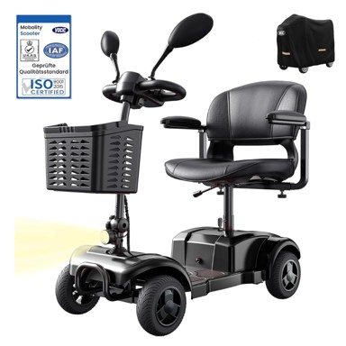 Sklopivi električni romobil za starije osobe koristi olovnu bateriju 24 V/12 Ah za domet do 20 km i motor 250 W, uz maksimalnu brzinu do 6 km/h (5 postavki). Ima 4 kotača s gumama otpornim na bušenje i savladava prepreke do 4 cm, nosivost je do 136 kg, a sjedalo je podesivo u 3 visine i rotira se 360°. Uključuje elektromagnetske kočnice, LED svjetla, retrovizore, zaštitne šipke protiv sudara i uklonjivu košaru 20 L, uz vodootpornu navlaku s reflektirajućim trakama.