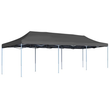 Sklopivi šator za zabave bit će idealan za širok raspon događanja na otvorenom, poput predstava, tržnica, sportskih događaja, vjenčanja, zabava, roštilja, kampiranja, festivala itd. Vrtni šator ima krov koji je otporan na UV-zračenje i vodu, a napravljen je od tkanine Oxford s PVC premazom i stoga je savršen za uporabu na otvorenom. Okvir je izrađen od čelika otpornog na hrđu, što čini vrtni šator stabilnim i izdržljivim. Prigodni šator za proslave može se sklopiti radi jednostavne pohrane i transporta. Lako se sastavlja. NAPOMENA: Preporučujemo tretiranje tende vodootpornim sprejem ako je šator izložen velikim kišama. Ovaj se proizvod NIKAD ne smije upotrebljavati u lošim vremenskim uvjetima, kao što su jak vjetar, jaka kiša, snijeg, oluja itd. - Boja: Antracit - Materijal okvira: Čelik obložen prahom - Materijal krovnog pokrova: Tkanina 600D Oxford s PVC oblogom - Dimenzije: 870 x 291 x 315 cm (D x Š x V) - Visina strehe od tla: 2,35 m - Otporno na UV-zračenje i vodu - Uključeno 12 kolaca za tlo i 6 konopaca - Tkanina: Poliester: 100%