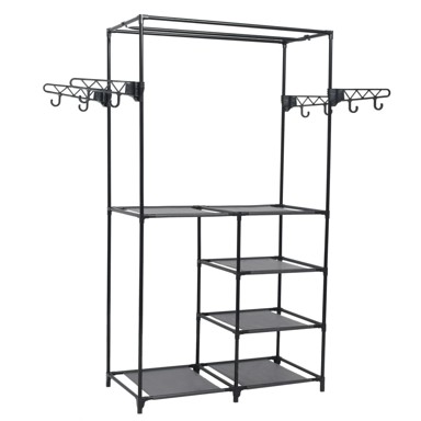 Minimalistički stalak za odjeću idealno je rješenje za pohranu za spavaću sobu ili kupaonicu. Ima cjevasti okvir od čelika obloženog prahom, koji je lagan ali ipak čvrst, zbog čega se stalak za odjeću lako pomiče okolo i prilično je izdržljiv. Ima četiri polica koje su izrađene od ekološki prihvatljive, netkane tkanine i dizajnirane kako bi čuvale vaše torbe, cipele ili male predmete organiziranima i na dohvat ruke. Također ima četiri bočne drške s kukama radi dodatnog prostora za pohranu vaše duže odjeće kao što su kaputi i jakne. Sastavljanje je jednostavno. - Boja: Crna - Materijal: Cijevi od čelika obloženog prahom + netkana tkanina - Dimenzije: 87 x 44 x 158 cm (D x Š x V) - Nosivost stalka za odjeću: 12 - 16 kg - Nosivost svake police: 8 kg - S 4 vješalice na bočnim drškama - S 4 police - Jednostavno sastavljanje - Tkanina: Polietilen: 100%