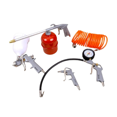 STRONG set zračnih pištolja 5/1 namijenjen je radu s komprimiranim zrakom i kompatibilan je sa svim vrstama kompresora. U kompletu se nalaze pištolj za farbanje za nanošenje premaza na drvene, plastične i metalne površine, pištolj za čišćenje za ispiranje dijelova i alata te mogućnost podmazivanja, pištolj za napuhivanje guma s mjerenjem tlaka i pištolj za puhanje zraka za uklanjanje prašine i nečistoća. Spiralno crijevo s brzom spojnicom omogućuje jednostavno spajanje alata s kompresorom, što set čini praktičnim za radionice, auto-servise i proizvodnju namještaja.