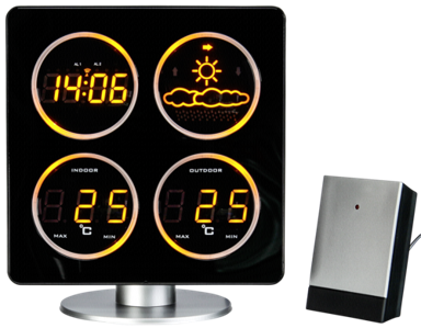 Proficell meteorološka stanica WS 6830 s radio kontroliranim satom i ambijentalnim LED zaslonom u boji jantara donosi funkcionalnost i stil u vaš dom. S prikazom unutarnje i vanjske temperature te prognozom vremena s indikatorom tendencije, uvijek ćete biti informirani o trenutnim vremenskim uvjetima.