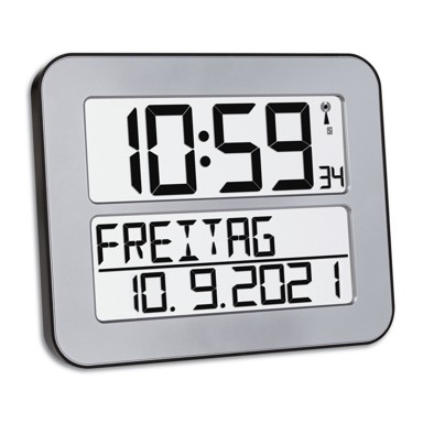 TFA 60.4512.01 Digitalni radio-kontrolirani sat TIMELINE MAX u srebrnoj boji ima veliki, jasno raspoređen zaslon koji je lako čitljiv čak i s udaljenosti. Prikazuje vrije... Pročitaj više