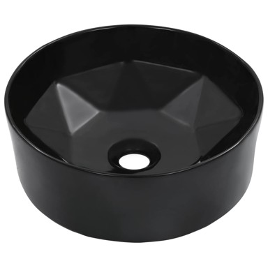 Napravljen od keramike, ovaj okrugli umivaonik s dizajnom dijamanta bit će moderan i bezvremenski dodatak svakoj kupaonici, toaletu ili garderobi. Ovaj umivaonik može služiti kao posuda za svakodnevnu uporabu, ali i kao ukras za vaš životni prostor. Zahvaljujući svom popularnom i suvremenom dizajnu, ovaj umivaonik sigurno će odgovarati svakom uređenju. Napravljen od keramike, umivaonik je vrlo jednostavan za čišćenje. Osim toga, sjajni završni sloj dodaje šarmantnu notu ovom umivaoniku za kupaonicu. Napomena: Slavina nije uključena u isporuku. - Boja: Crna - Materijal: Keramika - Ukupne dimenzije: 36 x 14 cm (Promjer x V) - Promjer otvora za odvod: 4,5 cm - Vrsta instalacije: Iznad pulta