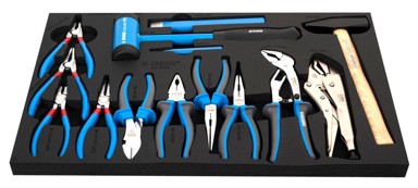 UNIOR Set kliješta i čekića 964/32SOS (621391) u SOS kutiji sadrži 12 različitih kliješta, čekića i pribora. Organizacija u ladici omogućuje brzi pristup alatima i sigurnu pohranu. Namijenjen je profesionalnim radionicama.