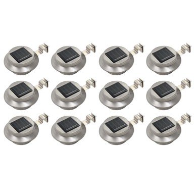 LED solarne svjetiljke opremljene su baterijom AA koja se puni sunčevom svjetlošću. Vanjske solarne svjetiljke mogu se ugraditi ispod krIli pričvrstiti na ogradu ili zid. S tri LED diode od 0,06 W unutra, svaka solarna svjetiljka može pružiti osvjetljenje od 0,18 W. Tijekom dana Svjetiljke pretvaraju dnevnu svjetlost u električnu energiju i pune bateriju. U sumrak se automatski pale i rade na električnoj energiji pohranjenoj tijekom dana. Koliko će svjetlost trajati, ovisi o količini pohranjene dnevne svjetlosti. Solarne svjetiljke štede energiju i zahtijevaju malo održavanja. Zahvaljujući priloženim nosačima za montažu, Solarne krovne svjetiljke lako se ugrađuju. Isporuka uključuje 12 LED solarnih svjetiljki, 12 montažnih nosača i vijke. - Boja: Srebrna - Materijal: Nehrđajući čelik - Dimenzije (svake): 12 x 6,5 cm (Promjer x V) - Boja svjetlosti: Ledena bijela - Napajanje: Solarno - Svaka solarna svjetijlka sadrži 3 LED diode (3 x 0,06 W) - Svaki komad s unaprijed instaliranom punjivom baterijom AA (1,2 V / NI-MH 600 mAh) - Isporuka uključuje 12 LED solarnih svjetiljki, 12 montažnih nosača i vijke
