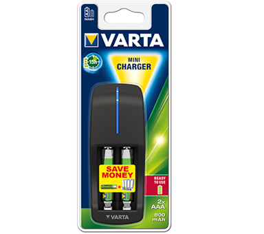 Punjač za baterije VARTA Mini Charger puni baterije 2xAA ili 2xAAA baterije. Vrijeme punjenja je 15 sati. U kompletu dolaze i 2xAAA baterije od 800mAh.