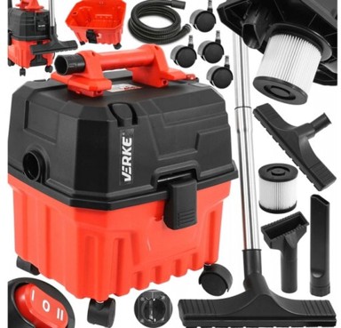 VERKE industrijski usisavač zapremine 15 litara i snage 1400 W idealan je za građevinske i zahtjevne poslove čišćenja. HEPA filtracija, mogućnost mokrog i suhog usisavanja te integrirana utičnica do 2000 W čine ga praktičnim i snažnim alatom za profesionalnu uporabu.