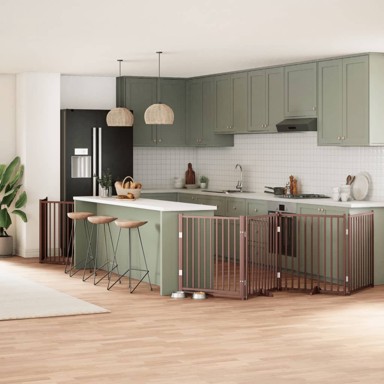 Vrata za pse stavljaju vašeg ljubimca u fiksno područje aktivnosti, u kojem ga možete čuvati na sigurnom i spriječiti da vas ometa. - Izdržljiv materijal: Vrata za pse napravljena su od drva topole s bojom na bazi vode, što ih čini izdržljivima, dugotrajnima i lakima za čišćenje. - Jednostavna za upotrebu: Vrata za pse ne zahtijevaju ugradnju ili bušenje koje oštećuje vaš dom. Ova vrata za pse mogu se potpuno sklopiti jer nemaju noge, što ih čini lakima za nošenje i spremanje u ormar ili negdje drugdje. - Praktičan dizajn: Vrata za pse imaju dvije čvrste noge, koje pružaju stabilnost i omogućuju jednostavno podešavanje. Uz to, uključuju panel s vratašcima i opremljena su bravama, što pruža povećanu sigurnost i praktičnost za vas i vaše ljubimce. - Višestruka primjena: Ova vrata za pse mogu učinkovito spriječiti vaše ljubimce da preskoče i prođu, stoga su savršena za sigurno držanje vaših ljubimaca u dnevnoj sobi, kuhinji, na stubištu i u predsoblju. - Boja: Smeđa - Materijal: Drvo topole - Dimenzije svakog panela: 80 x 90 x 2 cm (Š x V x Deb.) - Ukupna dužina: 640 cm - Razmak šipki: 6 cm - Dimenzije nogu: 30 x 8 x 2 cm (D x Š x V) - Prikladno za male/srednje pse - Samostojeća i sklopiva (bez ugradnje) - Sastavljanje potrebno: Da - Isporuka sadrži: - 7 x panel - 1 x panel s vratašcima - 2 x noga - 18 x šarka - 2 x brava za vrata - 3 x ključ