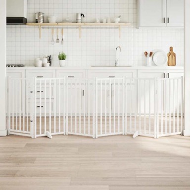 Vrata za pse stavljaju vašeg ljubimca u fiksno područje aktivnosti, u kojem ga možete čuvati na sigurnom i spriječiti da vas ometa. - Izdržljiv materijal: vrata za pse izrađena su od punog drva jele s bojom na bazi vode, što ih čini izdržljivima, dugovječnima i lakima za čišćenje. - Jednostavna za upotrebu: Vrata za pse ne zahtijevaju ugradnju ili bušenje koje oštećuje vaš dom. Ova vrata za pse mogu se potpuno sklopiti jer nemaju noge, što ih čini lakima za nošenje i spremanje u ormar ili negdje drugdje. - Praktičan dizajn: vrata za pse imaju dvije čvrste noge koje pružaju stabilnost i omogućuju jednostavno podešavanje. Dodatno, uključuje ploču vrata i opremljen je bravama, pružajući povećanu sigurnost i praktičnost za vas i vaše ljubimce. - Višestruka primjena: Ova vrata za pse mogu učinkovito spriječiti vaše ljubimce da preskoče i prođu, stoga su savršena za sigurno držanje vaših ljubimaca u dnevnoj sobi, kuhinji, na stubištu i u predsoblju. - Boja: Bijela - Materijal: Masivna jelovina - Dimenzije svakog panela: 50 x 90 x 2 cm (Š x V x Deb.) - Ukupna duljina: 300 cm - Razmak šipki: 6 cm - Dimenzije nogu: 30 x 8 x 2 cm (D x Š x V) - S lučnim vrhom - Prikladno za male/srednje pse - Samostojeća i sklopiva (bez ugradnje) - Sastavljanje potrebno: Da - Isporuka sadrži: - 5 x panel - 1 x panel s vratašcima - 2 x noga - 14 x šarka - 2 x brava za vrata - 1 x ključ