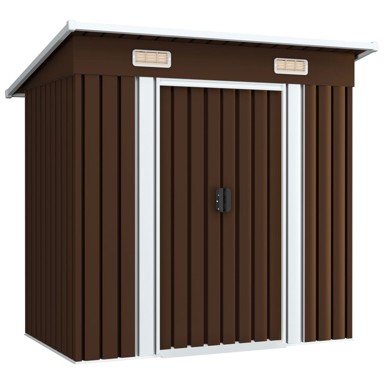 Metalna kućica za pohranu bit će savršena za spremanje širokog raspona alata i opreme. Ovo spremište opremljeno je ventilacijskim otvorima, što osigurava izvrsno prozračivanje i smanjuje nakupljanje vlage i mirisa u kućici. Dvostruka klizna vrata s prednje strane omogućuju jednostavan ulazak i izlazak. Zahvaljujući pocinčanom čeliku otpornom na koroziju, kućica za alat čvrsta je i izdržljiva te izgrađena da traje. Prethodno izrezani i izbušeni dijelovi te uključeni priručnik s uputama omogućit će vam brzo i jednostavno sastavljanje. - Boja: Smeđa - Materijal: Pocinčani čelik - Ukupne dimenzije (s krovom): 194 x 121 x 181 cm (Š x D x V) - S 2 ventilacijska otvora, svaki veličine 23 x 10 cm - Veličina kliznih vrata: 80 x 154 cm (Š x V) - Površina dna: 183 x 112 cm (Š x D) - S kvakom i kutnim štitnicima