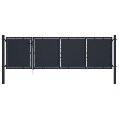 Čelična vrata bit će idealna ulazna točka za ogradu oko vašeg vrta ili dvorišta. Vrtna vrata napravljena su od čelika, što im osigurava izvrsnu izdržljivost i stabilnost. Zahvaljujući svojoj čvrstoj strukturi, vrata za ogradu daju dodatnu krutost. Uz to, naša će vrtna vrata pružiti visok stupanj sigurnosti i dodatnu privatnost, istodobno oblikujući sjajan ulaz na vaše imanje. Vrata također se isporučuju s dva čvrsta stupa ss snažnim šarkama za jednostavno postavljanje. Vrata se isporučuju sa setom brave, kvake i klina za tlo. - Boja: Antracit - Materijal: Čelik - Ukupna veličina: 350 x 125 cm (Š x V) - Visina panela: 75 cm - Dimenzije stupova: 6 x 0,2 cm (Promjer x Deblj.) - Uključen je set brave, kvake i klina za tlo
