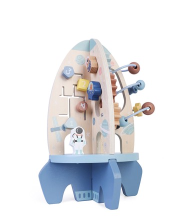 Activity raketa je Montessori igračka koja pomaže u razvoju motoričkih vještina, prostorne percepcije i kognitivnih sposobnosti. 360 stupnjeva zabavnog učenja Raketa sadrži razne elemente za igru koji će zabaviti i poučiti vašu djecu. Mogu kliziti perle u boji duž cik-cak žice u labirintu, što razvija njihovu finu motoriku i koordinaciju oko-ruka. Zahvaljujući kliznim zupčanicima, djeca će učiti o principu uzroka i posljedice. Mogu pomicati loptice na pultu kako bi vježbali orijentaciju u prostoru i naučili brojati. Sigurna zabava za djecu Ova motorna igračka nije samo zabavna, već je i sigurna za vašu djecu. Materijali koji se koriste su ekološki prihvatljivi, a drvena raketa je obojana bojama na bazi vode. Igračka prolazi rigorozna testiranja u unutarnjim i vanjskim laboratorijima kako bi zadovoljila najviše standarde kvalitete i sigurnosti. Drvena raketa za aktivnosti prikladna je za dječake i djevojčice i sadrži interaktivne elemente koji će zaokupiti pozornost svakog djeteta. Svaka strana rakete donosi novu avanturu i razvija različite vještine. Labirint za kretanje pomaže djeci da poboljšaju koordinaciju oko-ruka, motoriku i orijentaciju u prostoru. Uz čvrste noge, raketa ima visoku stabilnost, što omogućuje djeci da se igraju s igračkom sigurno i bez straha od prevrtanja. - Prikladno za djecu od 2 godine i više - Sigurne netoksične boje - Izdržljivo drvo - Montessori elementi - Zabavni elementi sa svake strane - Čvrste noge koje osiguravaju stabilnost - Dobar savjet za dar